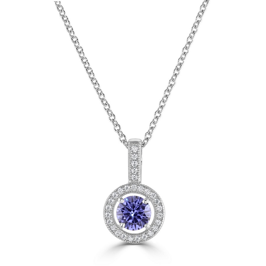 Beautiful Round "Halo" Pendant set with the finest Simulated Tanzanite and the best Cubic Zirconia Gems. Silver chain included in the price!