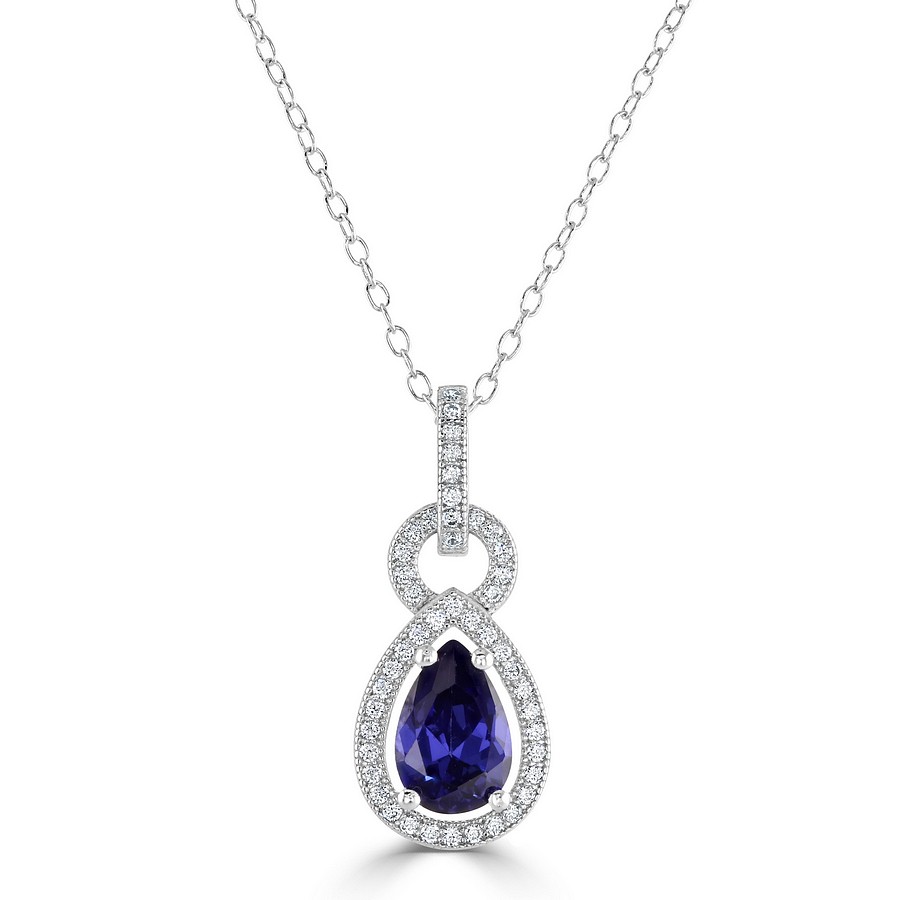 Elegant Pear Shape Drop "Halo" Pendant set with the finest Simulated Tanzanite and the best Cubic Zirconia Gems. Silver chain included in the price.