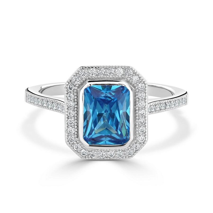 Stunning Emerald cut Simulated Blue Topaz ring set with the best Cubic Zirconia Gems.