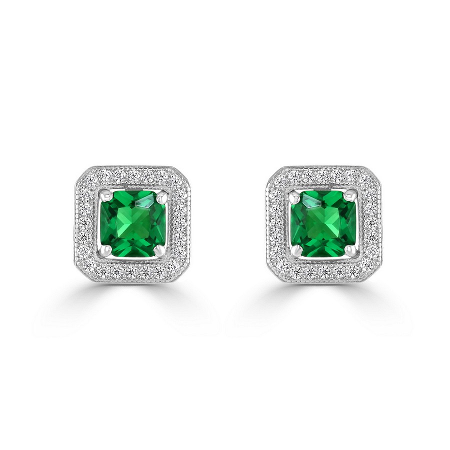 Square "Halo" stud earrings set with the finest Simulated Emerald and the best Cubic Zirconia Gems.